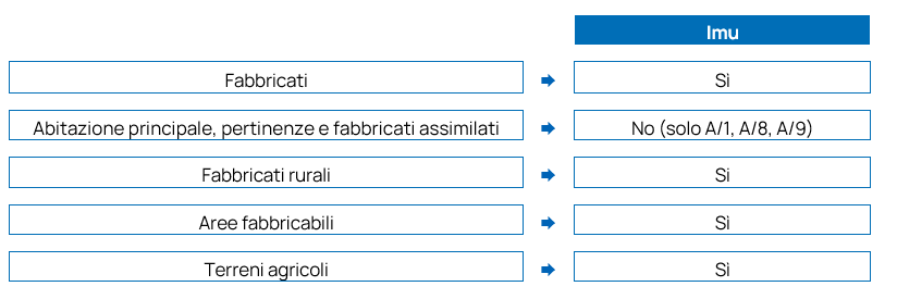 L’Imu è dovuta in relazione agli immobili posseduti sul territorio di ciascun Comune, con esclusione dell’abitazione principale (se l’immobile è diverso da A/1, A/8 e A/9) e delle relative pertinenze.