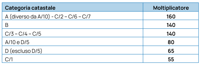 Ad esclusione dei fabbricati di categoria catastale D privi di rendita (per i quali si utilizzano i valori contabili rivalutati), per tutti gli altri fabbricati si farà riferimento alle rendite risultanti in catasto, vigenti al 1° gennaio dell’anno di imposizione, rivalutate del 5%, alle quali applicare specifici moltiplicatori.