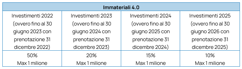 Il credito d’imposta per i beni compresi nell’allegato B annesso alla L. 232/2016 (i cosiddetti immateriali 4.0, ossia software e sistemi per l’automazione aziendale), effettuati a decorrere dal 1° gennaio 2022 e fino al 31 dicembre 2022 (ovvero entro il 30 giugno 2023, a condizione che entro la data del 31 dicembre 2022 il relativo ordine risulti accettato dal venditore e sia avvenuto il pagamento di acconti in misura almeno pari al 20% del costo di acquisizione), è pari al 50% della spesa.