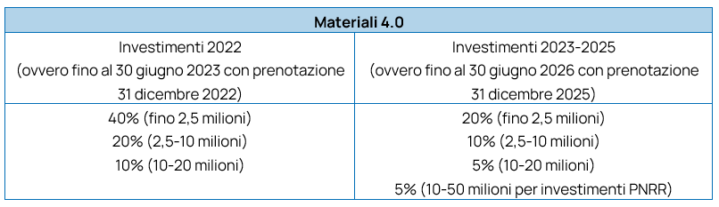 Gli investimenti effettuati nel triennio di proroga 2023/2025 ovvero entro il 30 giugno 2026 in caso di prenotazione presentano misure inferiori, pari al 20%-10%-5% in relazione alle richiamate fasce di spesa. Per gli investimenti inclusi nel PNRR diretti alla realizzazione di obiettivi di transizione ecologica il tetto sarà pari ad 50 milioni di euro, con credito pari al 5%.