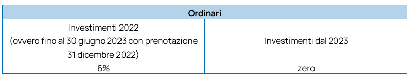 Il credito d’imposta per gli investimenti in beni diversi da quelli 4.0 (i cosiddetti beni “ordinari”), effettuati a decorrere dal 1° gennaio 2022 e fino al 31 dicembre 2022 (ovvero entro il 30 giugno 2023, a condizione che entro la data del 31 dicembre 2022 il relativo ordine risulti accettato dal venditore e sia avvenuto il pagamento di acconti in misura almeno pari al 20% del costo di acquisizione), è pari al 6% dell’investimento.