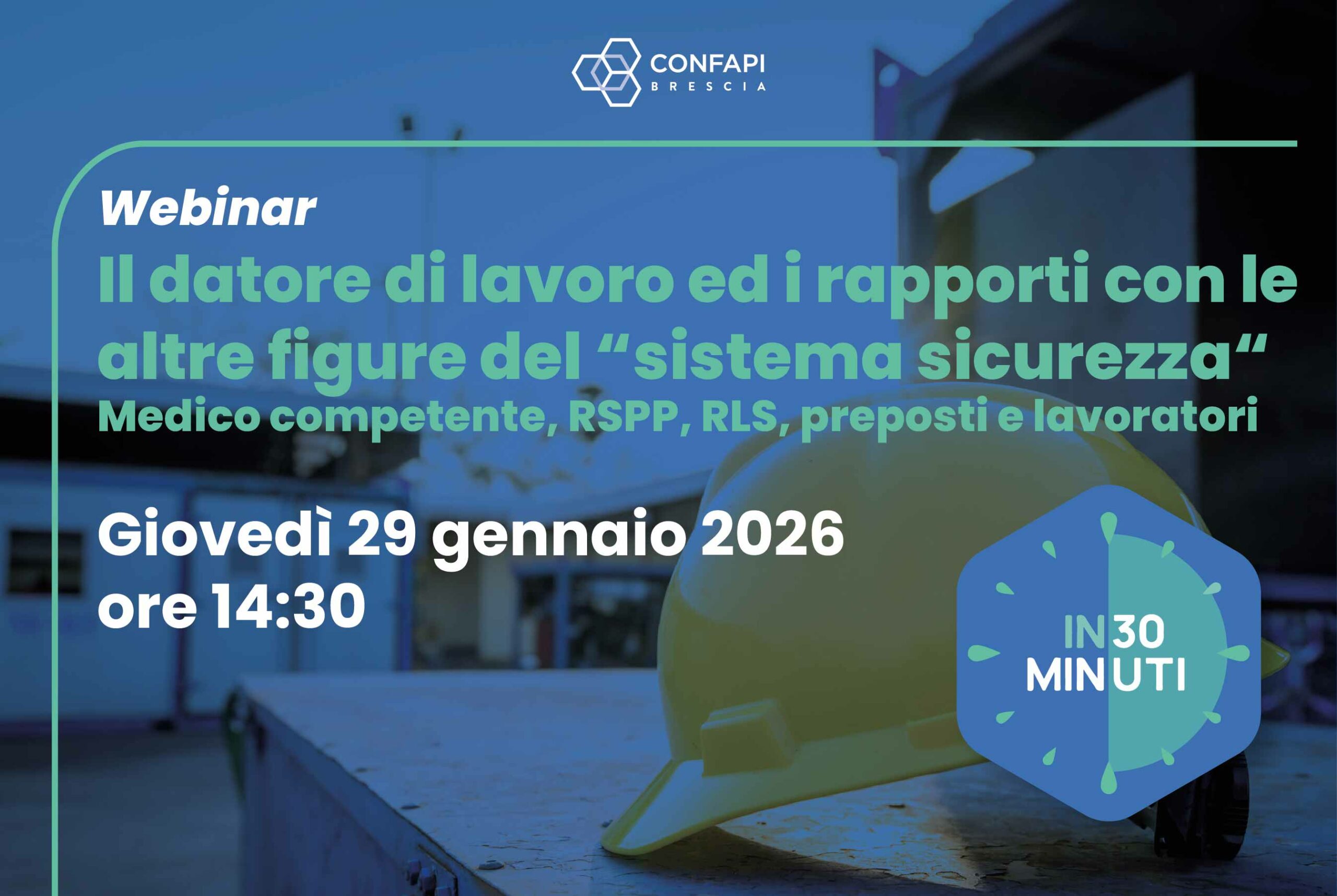 Il 2026 si apre con un nuovo ciclo di webinar «In 30 minuti» dal titolo «Sicuri al lavoro». Primo appuntamento giovedì 29 gennaio alle 14:30 con un approfondimento sul datore di lavoro in tema di sicurezza.