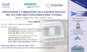 Si terrà giovedì 11 maggio nella sala Capretti dell’Istituto Artigianelli il workshop formativo sul tema “Innovazione e formazione nell’azienda digitale del settore meccanico/macchine utensili”, in occasione del quale sarà presentata la partnership tra Associazione Formazione Giovanni Piamarta, Siemens Italia e Apindustria.