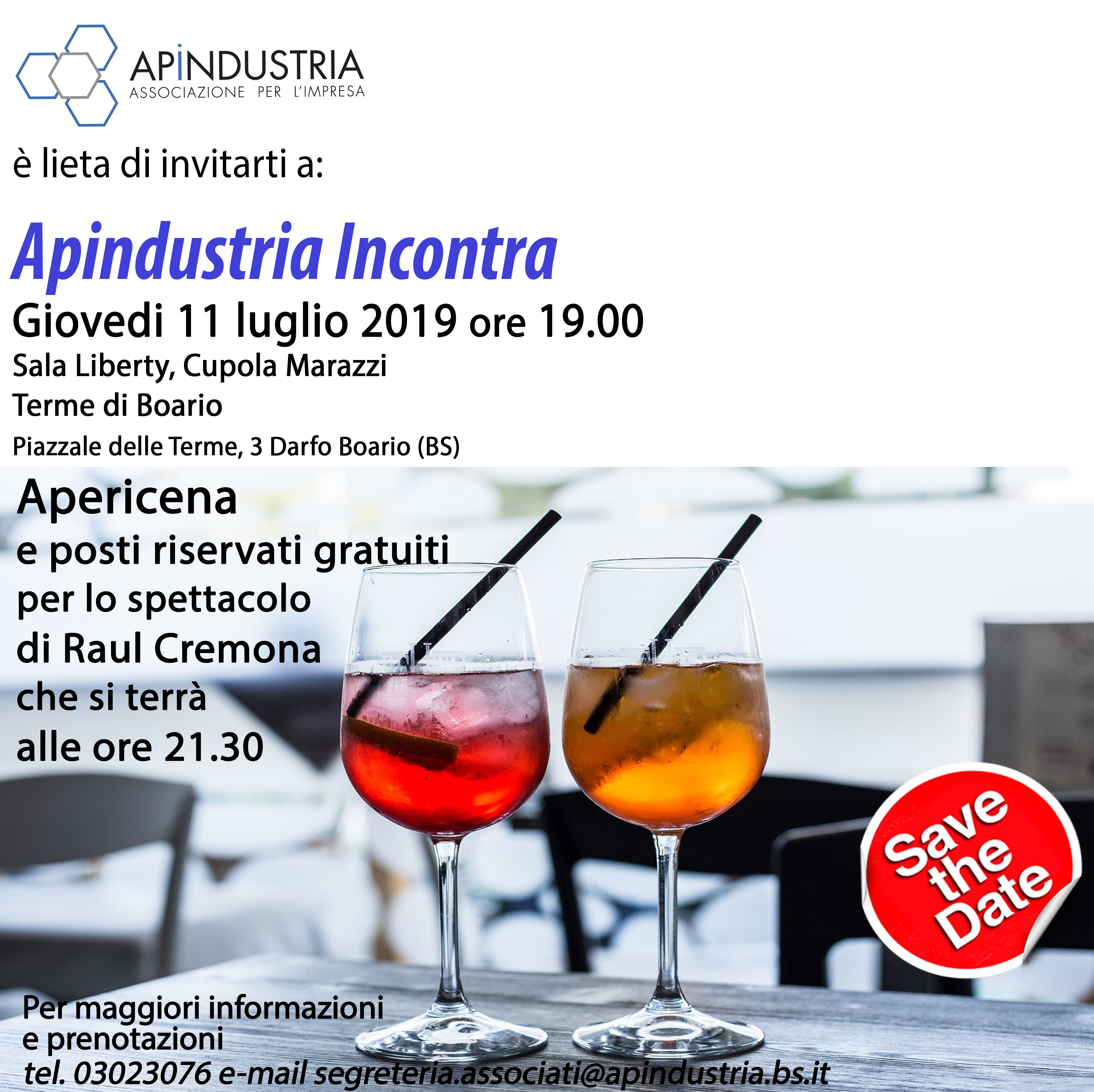 Apindustria è lieta di invitare i propri associati all’Apindustria Incontra che si terrà giovedì 11 luglio p.v. alle ore 19.00 nella splendida cornice delle Terme di Boario. Dopo la cena sarà possibile prendere posto, gratuitamente, allo spettacolo del comico Raul Cremona direttamente da Zelig e Colorado.