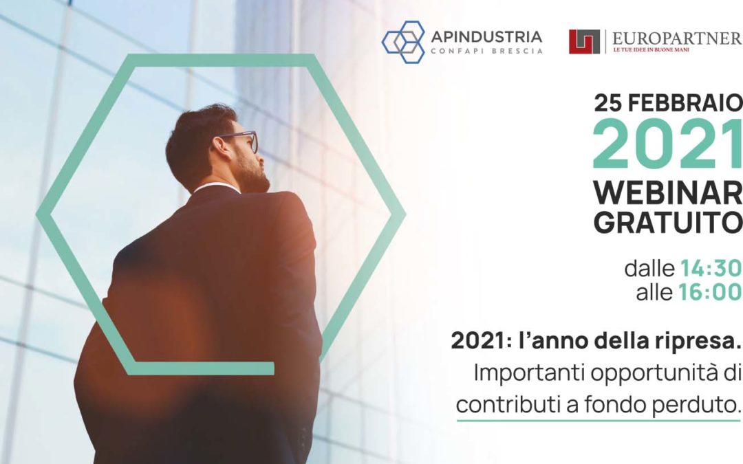Apindustria Confapi Brescia, in collaborazione con Europartner, organizza il webinar gratuito “2021: l’anno della ripresa. Importanti opportunità di contributi a fondo perduto”, che si terrà giovedì 25 febbraio p.v. Il 2021 sarà un anno con grandi potenzialità di contributi pubblici per chi vuole investire in tecnologie innovative: un’occasione da non sottovalutare.