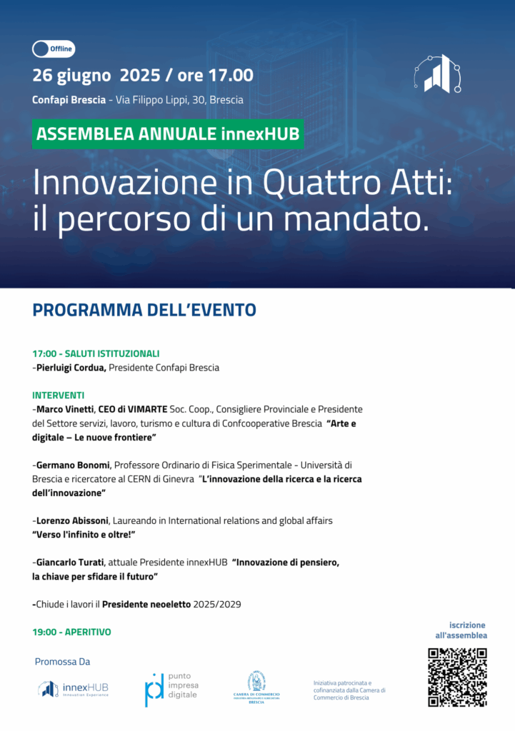 Confapi Brescia, in qualità di socio ordinario di InnexHUB, ospiterà l’Assemblea annuale del Digital Innovation HUB di Brescia, che si terrà il 26 giugno, alle ore 17:00 (accredito a partire dalle 16:30). Aprirà i lavori il presidente della nostra Associazione, Pierluigi Cordua.