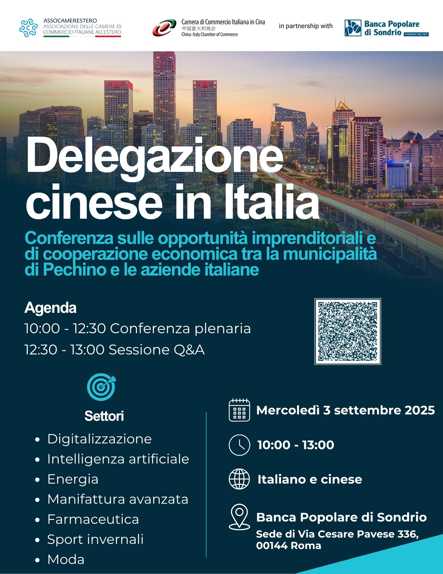 In occasione della visita in Italia della Delegazione del Bureau al Commercio della Municipalità di Pechino, si terrà un evento finalizzato a presentare le opportunità di collaborazione economica e industriale tra Pechino e le aziende italiane.