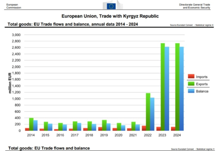 Alzi la mano chi saprebbe al primo colpo posizionare su una mappa il Kirghizistan, piccola repubblica ex sovietica nel cuore dell’Asia centrale a lungo non disturbata nel torpore della sua storia da Paese indipendente e apparentemente in minor smalto rispetto ad altri attori dinamici come Uzbekistan e Kazakistan. Biskek è però saltata agli onori dell’attenzione degli studiosi di economia e geopolitica per un dato a dir poco curioso: il boom di commerci con l’Unione Europea sperimentato dall’invasione russa dell’Ucraina a oggi. I dati ufficiali di Bruxelles parlano chiaro.