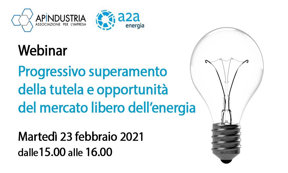 Webinar Apindustria – A2A Energia: “Progressivo superamento della tutela e opportunità del mercato libero dell’energia”. Il seminario online si terrà martedì 23 febbraio 2021, dalle 15.00 alle 16.00.